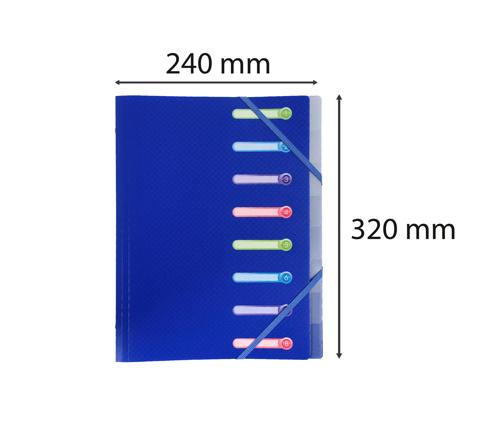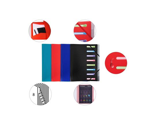 ECKSPANN-ORDNUNGSMAPPE AUS PP 500µ MIT GUMMIZUG UND 3 KLAPPEN, 8 FÄCHER MIT AUSGESTANZTEN INDEX-FENSTERN BLICKDICHT, FÜR FORMAT DIN A4 - FARBEN SORTIERT
