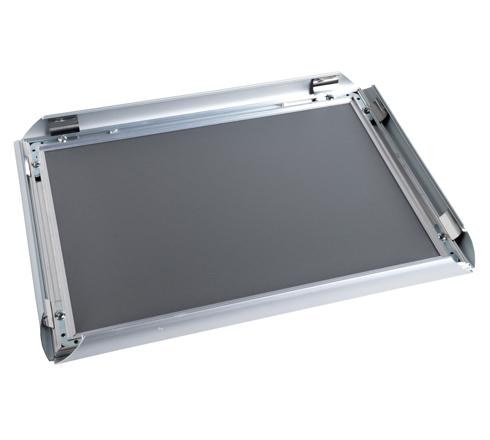 Wandplakatrahmen mit Rahmen aus Aluminium in A1 für die Wandmontage. Sowohl vertikal, als auch horizontal einsetzbar. Die Öffnung zum Aufklappen auf der Vorderseite ermöglicht ein leichtes Wechseln der Aushänge (Poster, Flyer etc.). Wird mit Hilfe des mitgelieferten Zubehörs an die Wand fixiert. Breite abgeschrägte Kante aus Aluminium, Rückwand aus PS, transparente Scheibe aus PVC, nicht spiegelnd.