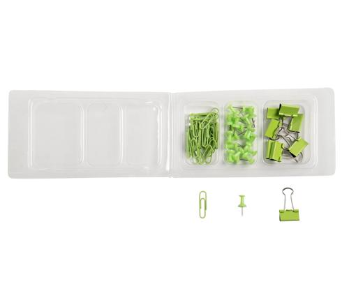 Das Set besteht aus 20 Pinnnadeln, 30 Büroklammern und 8 Foldback-Klammern aus Metall. In einem Kunststoffetui mit 3 Fächern.