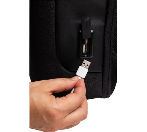 Das Hauptfach verfügt über zwei separate, gepolsterte Taschen für Tablet und Laptop bis zu 16 sowie mehrere Innenfächer mit Reißverschluss, um den Inhalt zu organisieren. Der Inhalt der Tasche kann durch eine herausnehmbare Trennwand in zwei separate Bereiche unterteilt werden. In der Seitentasche befindet sich eine wasserdichte Hülle, mit der die Tasche bei schlechtemWetter geschützt werden kann. Eine Schlaufe auf der Rückseite ermöglicht es, den Rucksack an dem Teleskopgriff eines Koffers zu befestigen. Mit einer kleinen Reißverschlusstasche auf der Rückseite für den schnellen Zugriff auf Portemonnaie, Smartphone ... Es besteht die Möglichkeit, ein Telefon oder ein Tablet über den integrierten USB-Anschluss aufzuladen (Kabel und Ladegerät sind nicht im Lieferumfang enthalten).