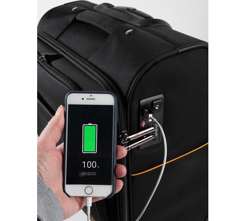 Es besteht die Möglichkeit, sein Smartphone oder Tablet aufzuladen dank des im Innenfach befindlichen integrierten USB-Anschlusses und Kabels. (2 USB-Anschlüsse und ein Mikro-USB-Anschluss, Ladegerät nicht im Lieferumfang enthalten).