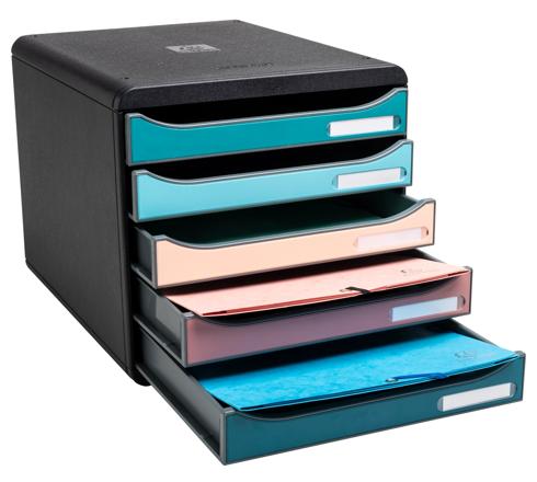 Die Schubladenbox Big Box Plus Skandi von Exacompta verfügt über 5 Schubladen, in denen Sie Dokumente im Format A4 und A4+, Sammelmappen mit Gummizug 24x32cm oder großformatige Umschläge ablegen können. Sie eignet sich für den Einsatz im Büro, Home Office oder in der Schule.