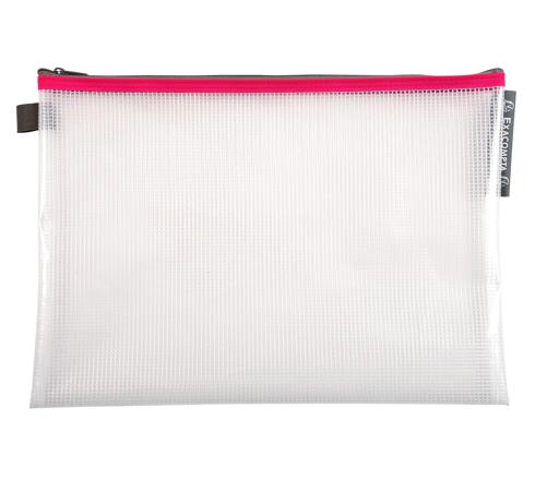 Die transparente Tasche mit Reißverschluss von Exacompta besteht aus EVA Kunststoff, einem häufig für Verpackung verwendetem Material, bekannt für seine Widerstandsfähigkeit und gleichzeitige Flexibilität. Relativ reißfest, einfach zu transportieren.