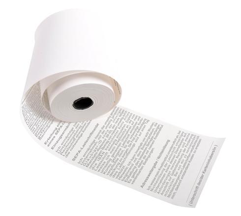 Diese Thermorollen sind auf der Rückseite mit einem deutschen Text für das SEPA-Lastschriftverfahren bedruckt.