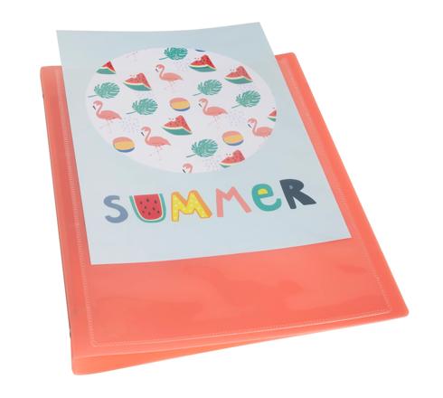 Ein Ringbuch mit 4 Ringen und 20mm Rückenbreite aus weichem und flexiblen Polyproplyen mit einer Sichttasche auf der Vorderseite, in die man ein personalisiertes Blatt einschieben kann.