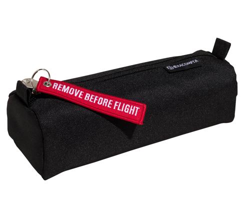 Inspiriert von der Welt der Luftfahrt verfügt dieses schwarze Schlampermäppchen mit seinem schlichten Design über einen abnehmbaren, multifunktionalen Anhänger mit der Aufschrift „Remove before flight". Dieses 3-in-1-Accessoire kann als Schlüsselanhänger, als Anhänger zur einfachen Kennzeichnung eines Rucksacks oder Gepäckstücks oder einfach als stilvolle Verzierung für das Federmäppchen selbst verwendet werden.