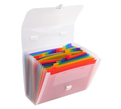 Diese Fächermappe, komplett aus Polypropylen, mit festem Druckknopf, verfügt über eine sehr große Ablagekapazität von etwa 800 Blättern, aufteilbar auf 24 Fächer.
