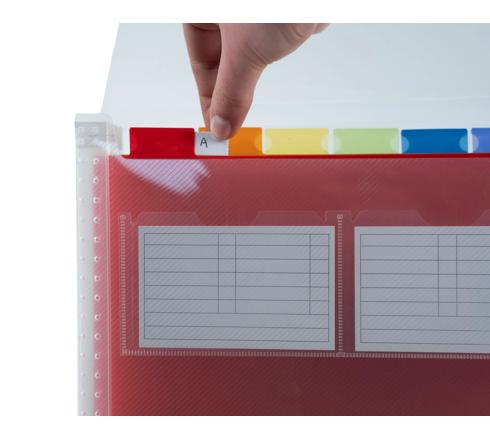Die Taben sind ausgestattet mit einem Etikettenhalter zur einfachen Identifizierung jedes einzelnen Faches. Zwei Etikettenbogen werden mitgeliefert. Diese sind mit Kreaman auf www.exacompta.com personalisierbar.