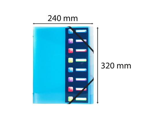 ECKSPANN-ORDNUNGSMAPPE AUS PP 500µ MIT GUMMIZUG UND 3 KLAPPEN, 8 FÄCHER MIT INDEX-FENSTERN, FÜR FORMAT DIN A4 - CRYSTAL COLOURS - FARBEN SORTIERT
