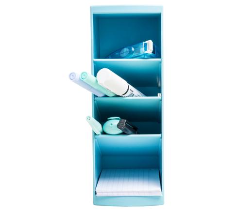 Mit seinen 4 unterschiedlich tiefen Fächern von 8 bis 11 cm kann der Multi tower als Stifteköcher, für Scheren, Haftnotizzettel, Mobiltelefonoder andere kleine Accessoires verwendet werden. Er kann sowohl stehend als auch liegend verwendet werden und ist aneinanderreihbar, so dass mehrere Multi tower mit den mitgelieferten Clips aneinander fixiert werden können. Dies ermöglicht es, die Organisation zu optimieren und die Aufbewahrungskapazität zu erhöhen.