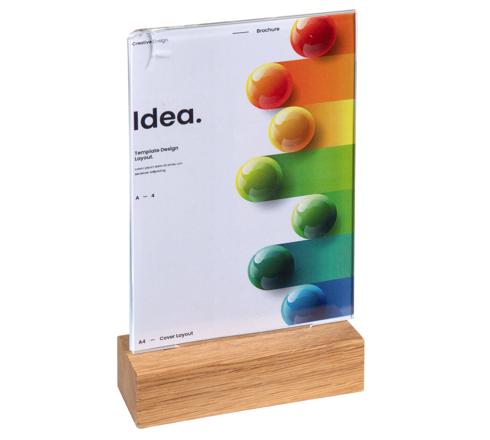 Gerader, vertikaler Tischaufsteller (in Form eines umgedrehten T). Mit einem Sockel aus massivem Eichenholz. Vorder- und rückseitig verwendbar.
