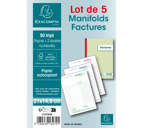 MANIFOLDS FACTURES 21X14,8CM - 50 FEUILLETS AUTOCOPIANTS TRIPLI- SOUS FILM PAR LOT DE 5