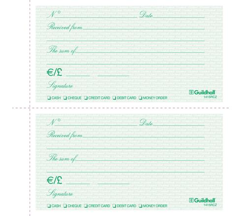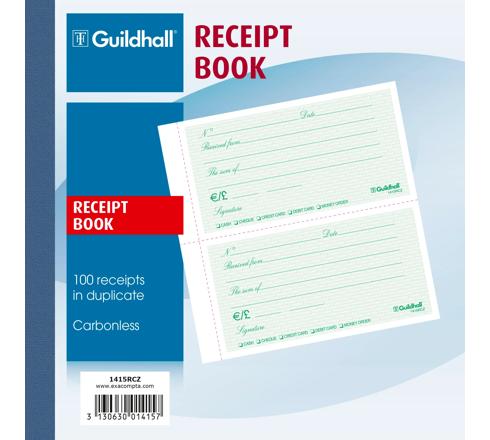 Guildhall receipt book with 100 receipts in duplicate, 145x148mm in size. Carbonless for ease of use and green printed lines for easy identification.
