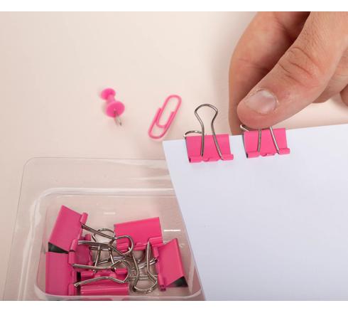 The kit is made up of 20 push pins, 30 letter clips (paperclips) and 8 double metal clips, all in a plastic case with 3 compartments.