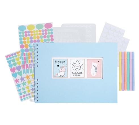Scrap booking set including 1 x scrapbook, 2 sheets of stickers, 2 stencils with multiple designs, 48 adhesive photo corners and 6 pastel felt tip pens, Everything you need to start creating your own journal and photo album.