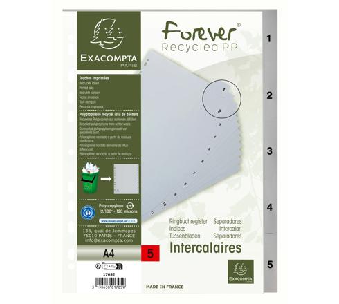 These Exacompta recycled polypropylene (PP) index dividers in A4 size with 5 parts numbered 1 to 5 are perfect for organising documents and paperwork in folders or binders, and the recycled material makes them an eco-friendly choice.