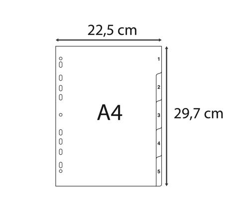 These Exacompta recycled polypropylene (PP) index dividers in A4 size with 5 parts numbered 1 to 5 are perfect for organising documents and paperwork in folders or binders, and the recycled material makes them an eco-friendly choice.