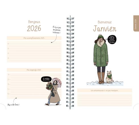 Pages spécifiques : une page de stickers fantaisie en début d'agenda, un récapitulatif des objectifs à la fin de chaque mois, les calendriers semestriels de l'année en cours et de l'année suivante. Couverture imprimée sur une carte souple, effet mat. Imprimé sur papier blanc, finition spiralée, coins détachables pour retrouver la semaine rapidement.
