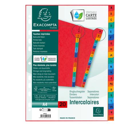 Exacompta Printed Pressboard Indices, A4, 225gsm, 20 part A to Z The Exacompta Indices are made from 225gsm premium quality coloured pressboard. The indices are A4 in size and are pre printed A to Z. The indices come in 20 parts and are pre punched so they can be inserted into files and folders 20 Tabs A to Z