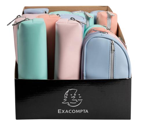 Exacompta Aquarel Pastel Pencil Cases, PU 3 shapes A range of pencil cases in trendy colours in a soft but washable and resistant rubber material. 3 shapes and 4 colours available under the same reference. Display of 18 assorted pencil cases. Lined case for better resistance.