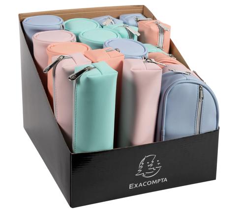Exacompta Aquarel Pastel Pencil Cases, PU 3 shapes A range of pencil cases in trendy colours in a soft but washable and resistant rubber material. 3 shapes and 4 colours available under the same reference. Display of 18 assorted pencil cases. Lined case for better resistance.
