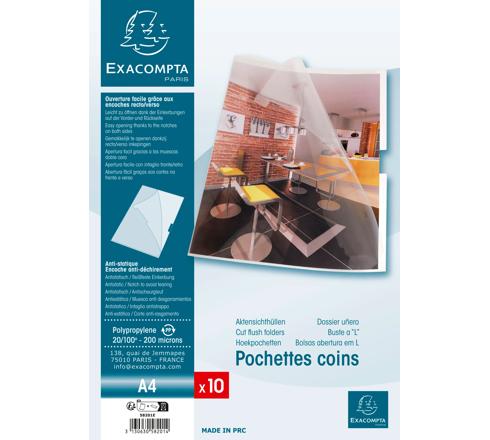 Pk 10 Corner Pockets Exac PP Clear Bag of 10 cut flush pockets with thumb holes high quality stiff 200µ glass clear polypropylene - A4 size Opening on both the top and the side for easy opening Made with rigid polypropylene for great protection of your documents Pack of 10