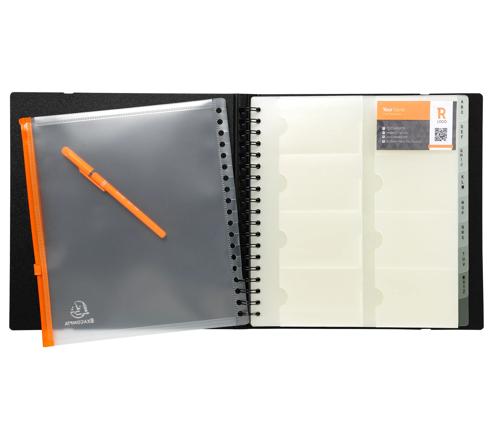 Exacompta Exactive Exacard Business Card Holder, Large The Exactive Exashow has a 0.2mm polypropylene cover. The card holder has 20 sheets for cards sized 60x90mm. 320 Cards. The holder has removable and repositionable pockets. Comes with dividers which are printed A to Z and repositionable. The Card holder is 26.5x25m.