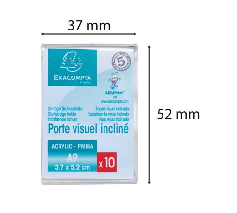 Set of 10 vertical A9 label holders The Exacompta free-standing label holder will allow you to slide in labels, names etc. Made of high quality acrylic (PMMA) with very high transparency. Made in Europe, it is guaranteed for 5 years and is UV resistant so it will not yellow You can easily create your personalised signs in the right size with KREAMAN on www.exacompta.com