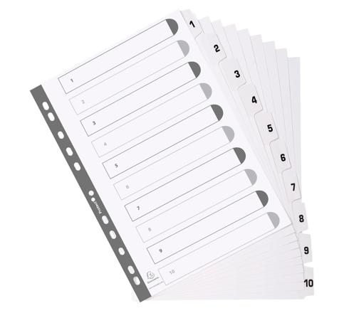 Exacompta Mylar Printed Indices, A4, 10 Part 1 to 10 The Exacompta Indices are made from 160gsm white card with white reinforced plastic tabs. The indices are A4 in size and are pre printed with 1 to 10. The indices are pre punched so they can be inserted in files and folders. Tabs printed on both sides The indices come with a printed index page for identifying contents. The indices come in 10 parts Numbered tabs 1 to 10