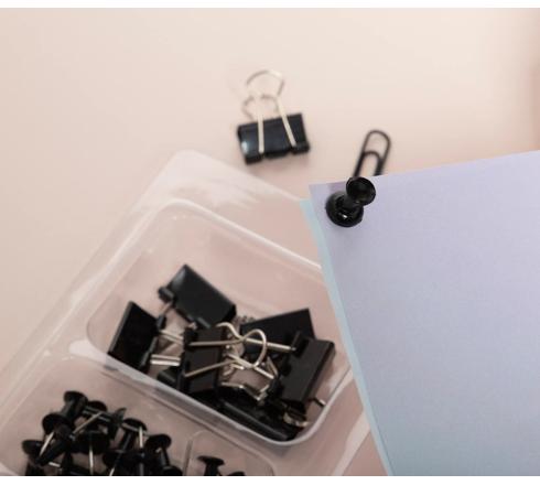 Comodidad y versatilidad: Incluye 20 push pins, 30 clips y 8 pinzas doble clips, lo que permite al usuario elegir el método de fijación más adecuado según la cantidad de documentos y el tipo de presentación.