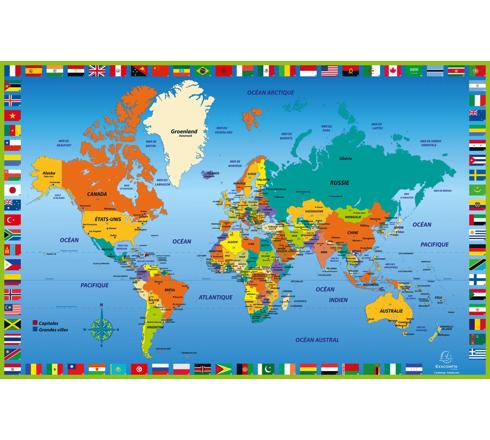 Educatif avec sa carte du monde imprimée, il permettra aux jeunes et moins jeunes de découvrir ou se remémorer les noms des pays, les principaux drapeaux et les frontières géographiques.