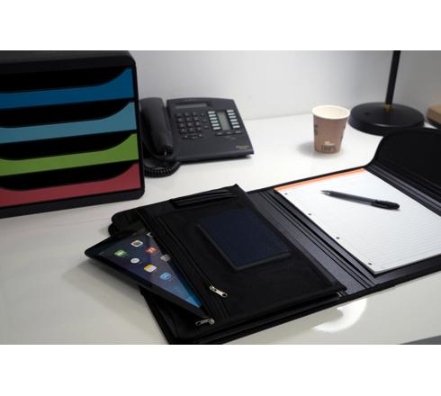 Trieur 6 compartiments avec porte-bloc et bloc-notes,avec compartiment renforcé pour tablette, pochettes avec fermeture zip et porte-stylo. Le porte-bloc s'adapte à tous les blocs et cahiers à spirales.