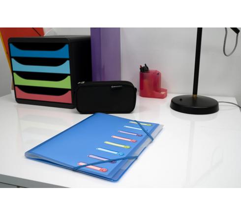 Clasificador con 3 solapas en la tapa trasera, que permite el almacenamiento de documentos. Cierre elástico para transporte seguro.