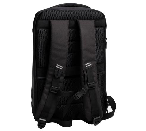 Le compartiment principal contient 2 poches matelassées séparées pour tablette et ordinateur jusque 16'', ainsi que plusieurs poches intérieures zipées pour organiser le contenu. Le contenu du sac peut être organisé en deux parties distinctes grâce à une séparation amovible. Un passant au dos permet de glisser le sac à dos le long d'une poignée télescopique de valise. Avec une petite poche zippée à l'arrière pour accéder rapidement à son portefeuille, téléphone, ... Possibilité de recharger un téléphone ou une tablette grâce au port USB intégré (câble et chargeur non fournis).