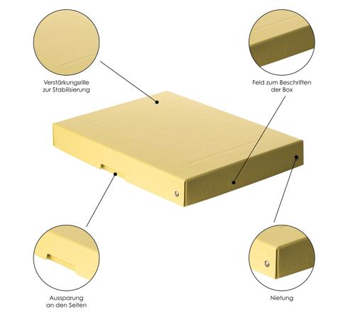 Ses poignées pratiques, ses champs d'inscription et rainures de renfort sur le couvercle sont gages de sa qualité de conception.
