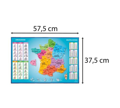 Educatif, il affiche une carte de France imprimée, les tables de multiplications, et les principales règles de conjugaison. Il permet ainsi aux jeunes et moins jeunes de découvrir ou se remémorer les noms des régions, des grandes villes, et d'une façon générale la géographie Française tout en révisant les multiplications et la conjugaison de base.