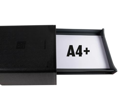 Les façades des tiroirs sont ouvertes pour permettre de glisser les documents sans avoir à ouvrir les tiroirs. Les tiroirs sont agréables à utiliser, coulissants et silencieux équipés d'une butée d'arrêt de sécurité.