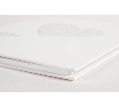 Un livre d'or blanc à la couverture blanche légèrement pailletée, et ornée d'un marquage coeur argenté, pour conserver le souvenir des moments forts de la vie.