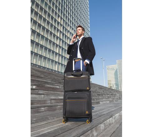 Un passant au dos permet de glisser la sacoche le long d'une poignée télescopique de valise.
