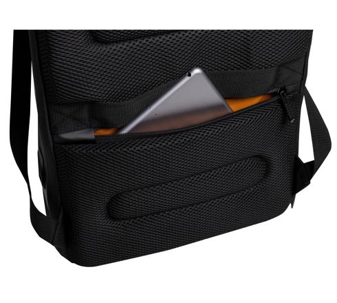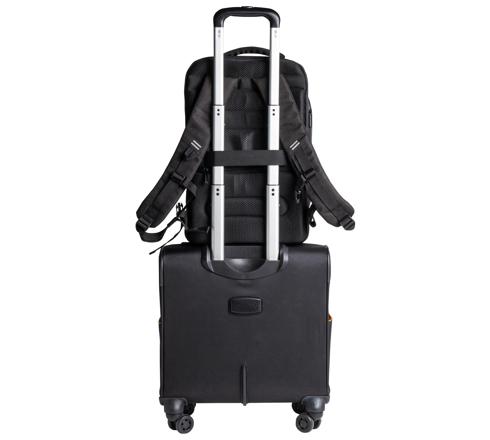 Le compartiment principal contient 2 poches matelassées séparées pour tablette et ordinateur jusque 16'', ainsi que plusieurs poches intérieures zipées pour organiser le contenu. Le contenu du sac peut être organisé en deux parties distinctes grâce à une séparation amovible. Un passant au dos permet de glisser le sac à dos le long d'une poignée télescopique de valise. Avec une petite poche zippée à l'arrière pour accéder rapidement à son portefeuille, téléphone, ... Possibilité de recharger un téléphone ou une tablette grâce au port USB intégré (câble et chargeur non fournis).