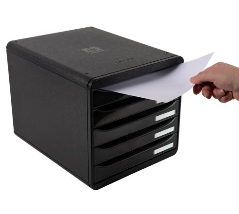 Les façades des tiroirs sont ouvertes pour permettre de glisser les documents sans avoir à ouvrir les tiroirs. Les tiroirs sont agréables à utiliser, coulissants et silencieux équipés d'une butée d'arrêt de sécurité. Ils sont équipés de porte-étiquette pour identifier chaque compartiment.