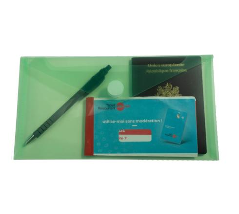La pochette format chéquier se ferme aisément grâce à sa fermeture scratch et offre ainsi une excellente protection des petits documents ou objets (chèques, tickets, feuilles A4 pliées, stylo, ... ) au format 25x13 ,5cm maximum.