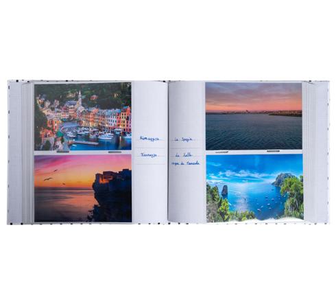 Les pages intérieures sont imprimées en gris clair avec un espace pour légender chaque photo. Pochettes avec insertion des photos par le côté, sans avoir besoin de les coller.