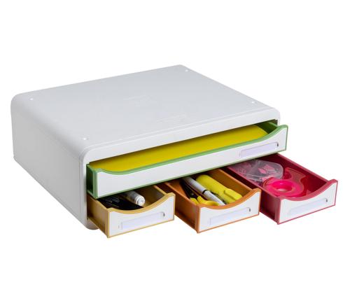 Cassettiera composta da 4 cassetti tra 1 grande che consente l'inserimento diretto dei documenti (A4, A4+ o 24x32 cm) nel cassetto s enza doverlo aprire e 3 cassetti piccoli per riporre oggestica.