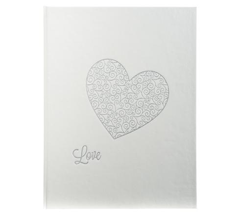 Un livre d'or blanc à la couverture blanche légèrement pailletée, et ornée d'un marquage coeur argenté, pour conserver le souvenir des moments forts de la vie.