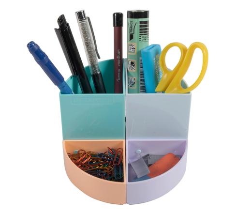 Scomparti intercambiabili tra di loro per creare un organizzatore circolare da scrivania.
