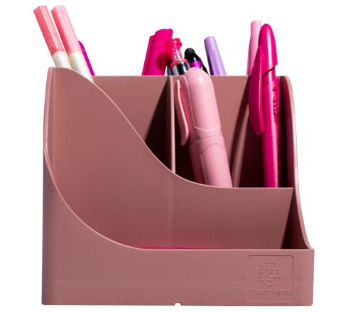 Composto da 4 scomparti alti per riporre forbici, matitte, penne, ecc e 1 scomparto più basso per piccoli oggetti come graffette, puntine da disegno, chiavette USB o cellulare.