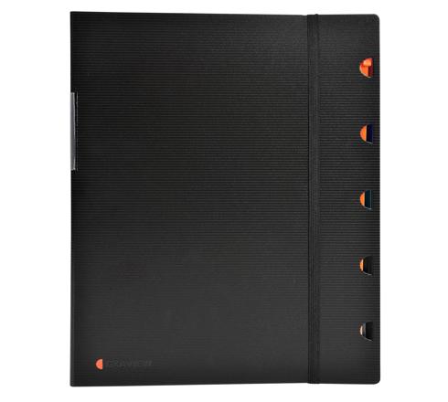 Copertina in polipropilene rigido, chiusura con elastico verticale, portaetichetta sul dorso per identificazione del contenuto.