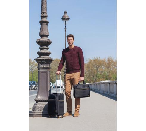 Dankzij een lus aan de achterkant kan de tas langs een telescopisch kofferhandvat worden geschoven.