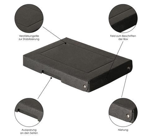 Deze dozen zijn niet alleen praktisch, ze zijn ook ecologisch. Ze zijn plasticvrij en deksel en doos worden gebundeld met een papieren lint. Ze zijn Vegan, Blauwe Engel en FSC® gecertificeerd.